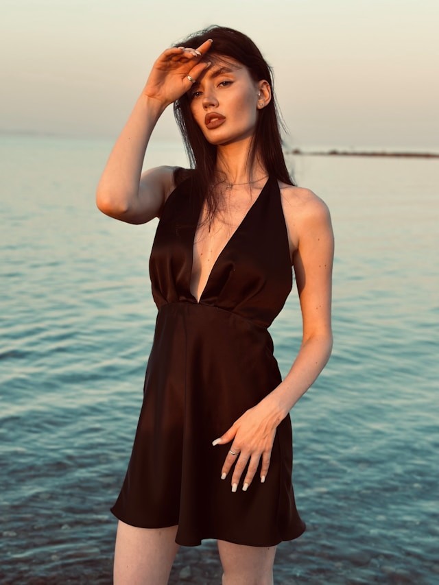 La robe noire d’été n’est pas celle qu’on porte en hiver. Elle est plus aérienne, plus courte ou fendue, souvent sans manches ou dos-nu, et elle laisse respirer la peau.